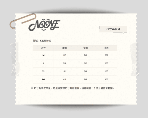 商品為預購 預購商品約 7~14 天出貨, 等一下下,我們會幫你顧好好。 洗衣指南|有洗有保佑 衣服不會自己洗,亂洗會出事,以下是正解: 衣服翻面再丟洗衣機,給它一層保護罩 顏色分開洗,不然洗完變撞色設計你會哭 漂白劑是兇手,烘衣機是加害者,能不用就別用 曬太陽記得反面曬,帥不怕曬,但布料怕 熨斗要低溫,別燙到變形,走鐘誰都不想看 一句話:你怎麼對待它,它就怎麼挺你。 型號:K2JN7089 size L, M, XL, XXL 商品評價 目前沒有評價。 只有註冊並且購買過商品的顧客才能撰寫評價。